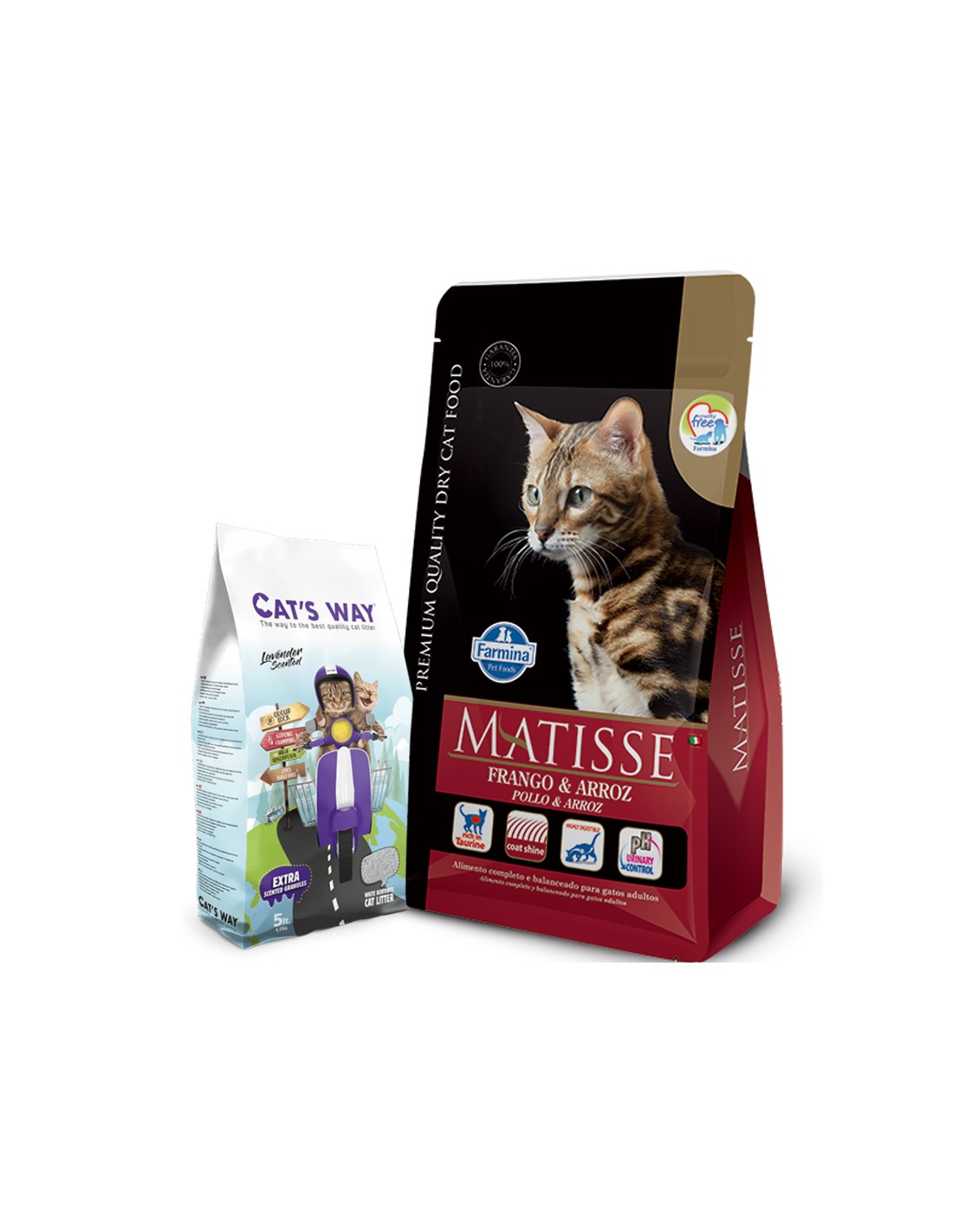 Matisse Frango & Arroz contiene la cantidad ideal de taurina, importante aminoácido para el buén desempeño del miocardio y de la visión. La dieta es complementada por el aporte de todas las vitaminas y minerales necesarios para una alimentación completa y balanceada.