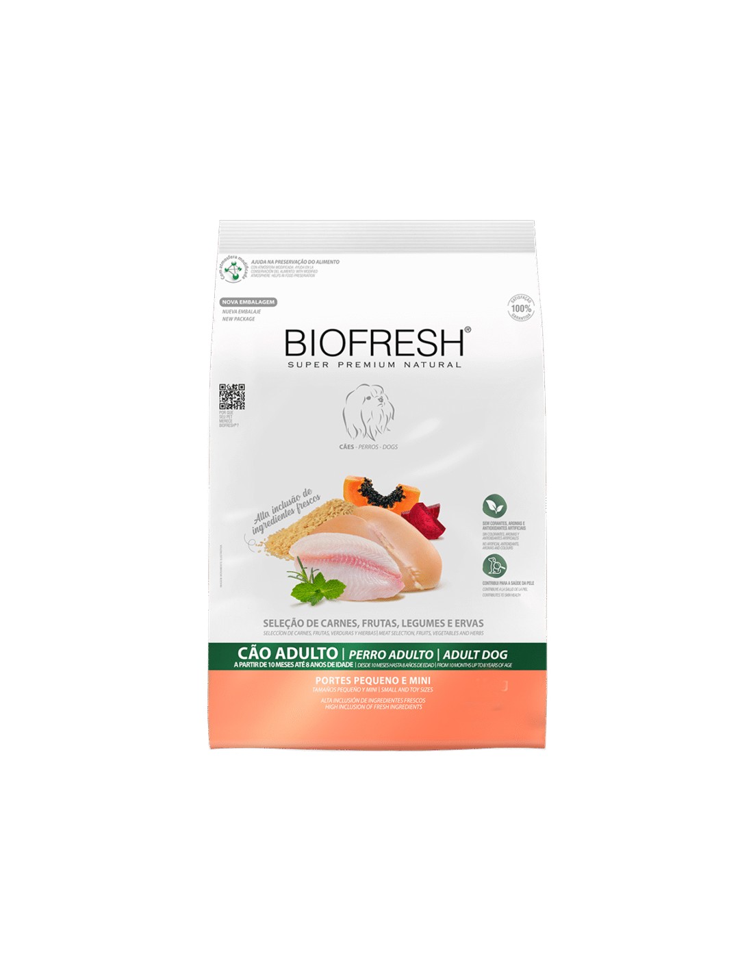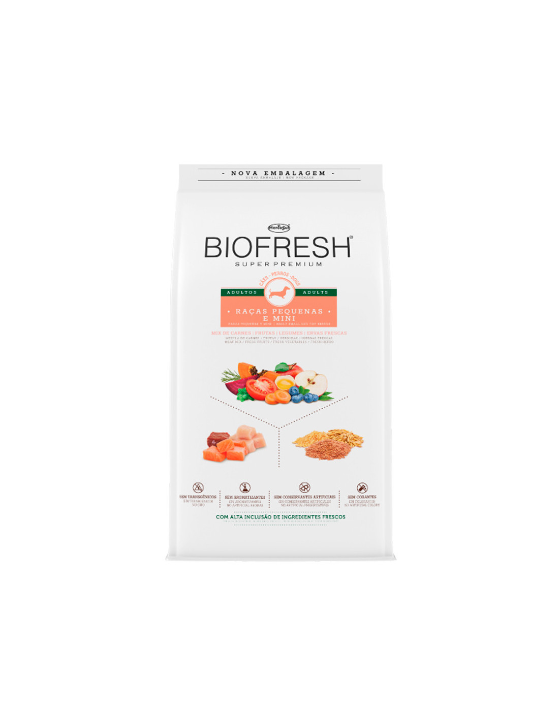Selección de carnes frescas (filete de castaña, carne de pollo y hígado de pollo - fuentes naturales de glucosamina) (mín. 15%), selección de frutas, verduras y hierbas frescas (manzanas, papayas, remolachas, zanahorias y orégano - fuentes naturales de betacaroteno, vitaminas, minerales y fibras) (mín. 5%), pulpa de tomate concentrada (fuente natural de licopeno), camomila en polvo, polvo de arándano, huevo entero en polvo (pasteurizado), aceite de pescado refinado (fuente natural de EPA y DHA), harina de chicharrón, harina de vísceras de pollo y grasa de pollo (preservados naturalmente con tocoferoles y extracto de romero), grano de sorgo, guisantes deshidratados, salvado de guisante, fibra de caña de azúcar, arroz integral, cáscara de arroz, semillas de lino, pulpa de remolacha, celulosa en polvo, extracto de yuca (mín. 0,02%), hidrolizado de hígado de pollo y cerdo, L-carnitina, sulfato de glucosamina, sulfato de condroitina, cloruro de sodio (sal común), hexametafosfato de sodio (mín. 0,3%), DL-metionina, L-lisina, cloruro de potasio, cloruro de colina, vitaminas (A, B1, B2, B6, B12, C, D3, E, K3, H, niacina, ácido pantoténico y ácido fólico), minerales orgánicos (quelato de aminoácidos de cobre, hierro, manganeso, zinc y complejo de selenio aminoácido), iodato de calcio y antioxidantes naturales (extracto de té verde, concentrado de tocoferoles, extracto de romero y ácido cítrico).