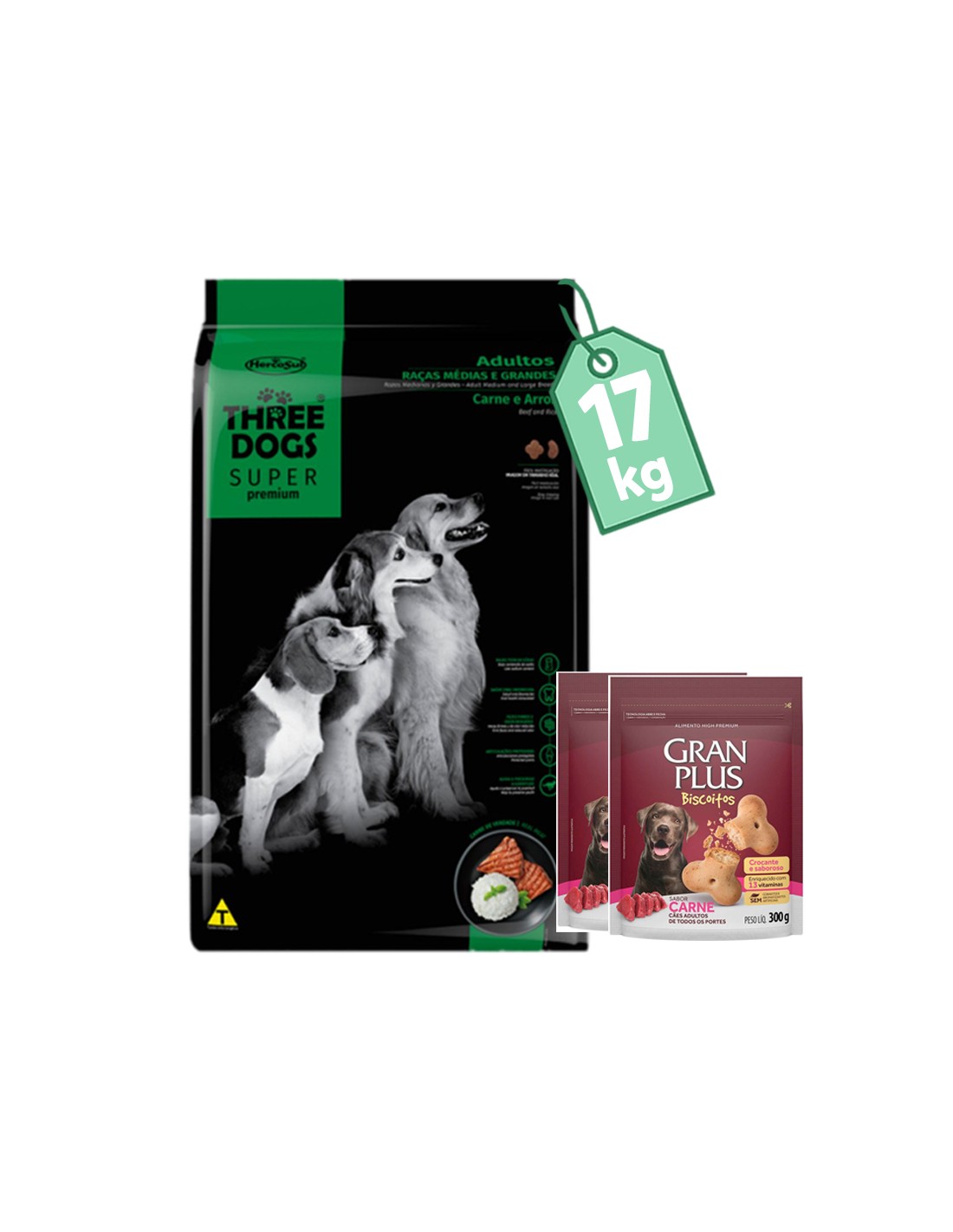 Three Dogs Súper Premium Adultos de Razas Medianas y Grandes – Carne y Arroz - Es un alimento rico en ingredientes de alta calidad que suministran todos los nutrientes necesarios para mantener la calidad de vida y longevidad de los perros. Desarrollado especialmente para las razas Medianas y Grandes, Three Dogs Súper Premium posee en su formulación carne fresca bovina, es fácil de digerir y muy sabroso.