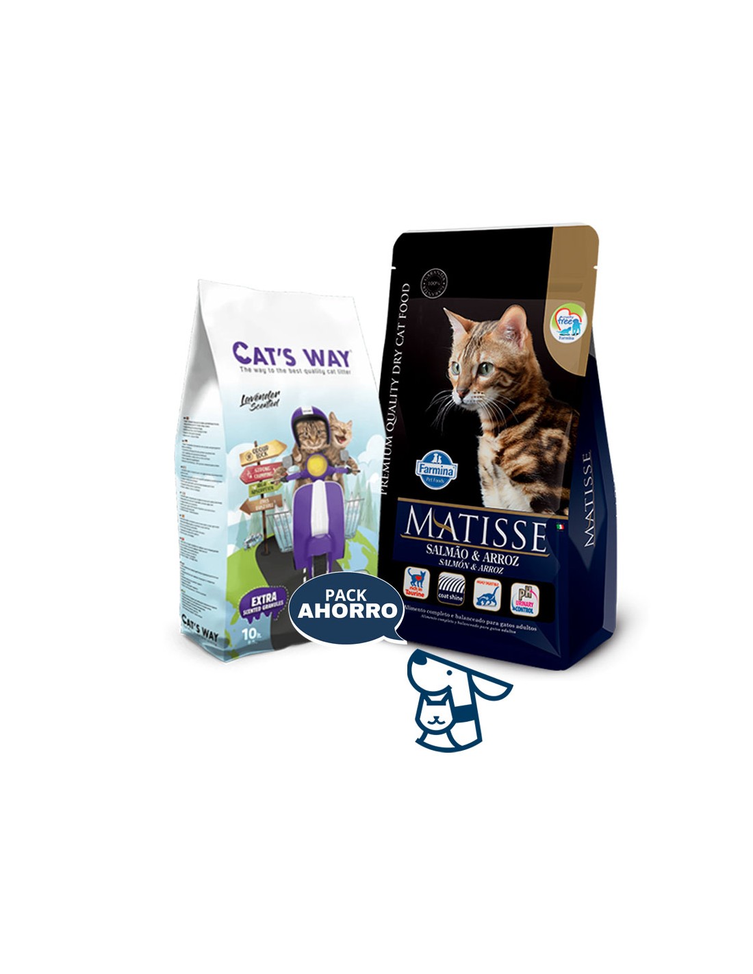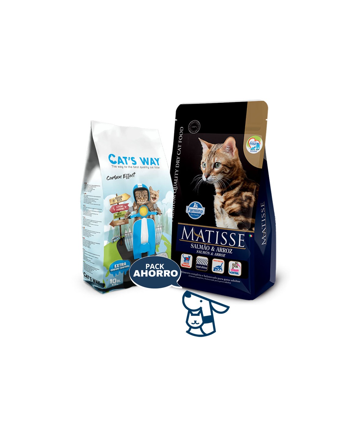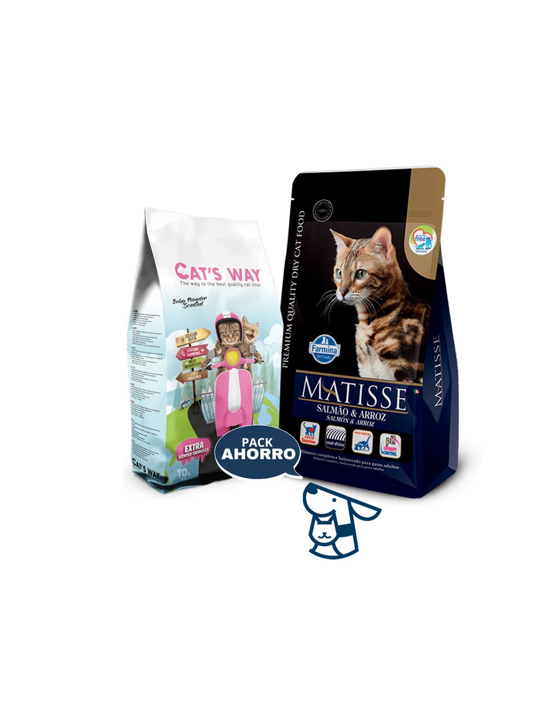 Combo Alimento Matisse Gato Adulto sabor Salmón y Arroz 7.5kg + 8.5kg (10 lts ) Arena Sanitaria Aglomerante CATSWAY , Aromas Lavada , Talco BB o sin aroma5