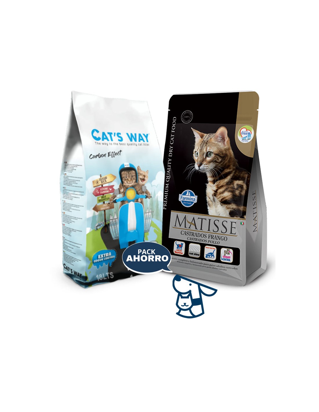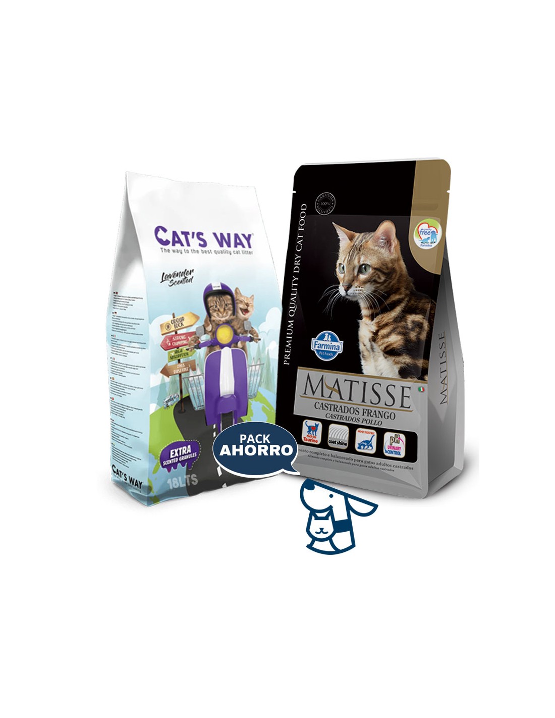 Combo Alimento Matisse para Gato Adulto Castrado sabor Pollo 7.5kg + 15.3KG (18LTS) Arena sanitaria aglomerante CATSWAY, aroma Lavanda o sin aroma efecto carbón