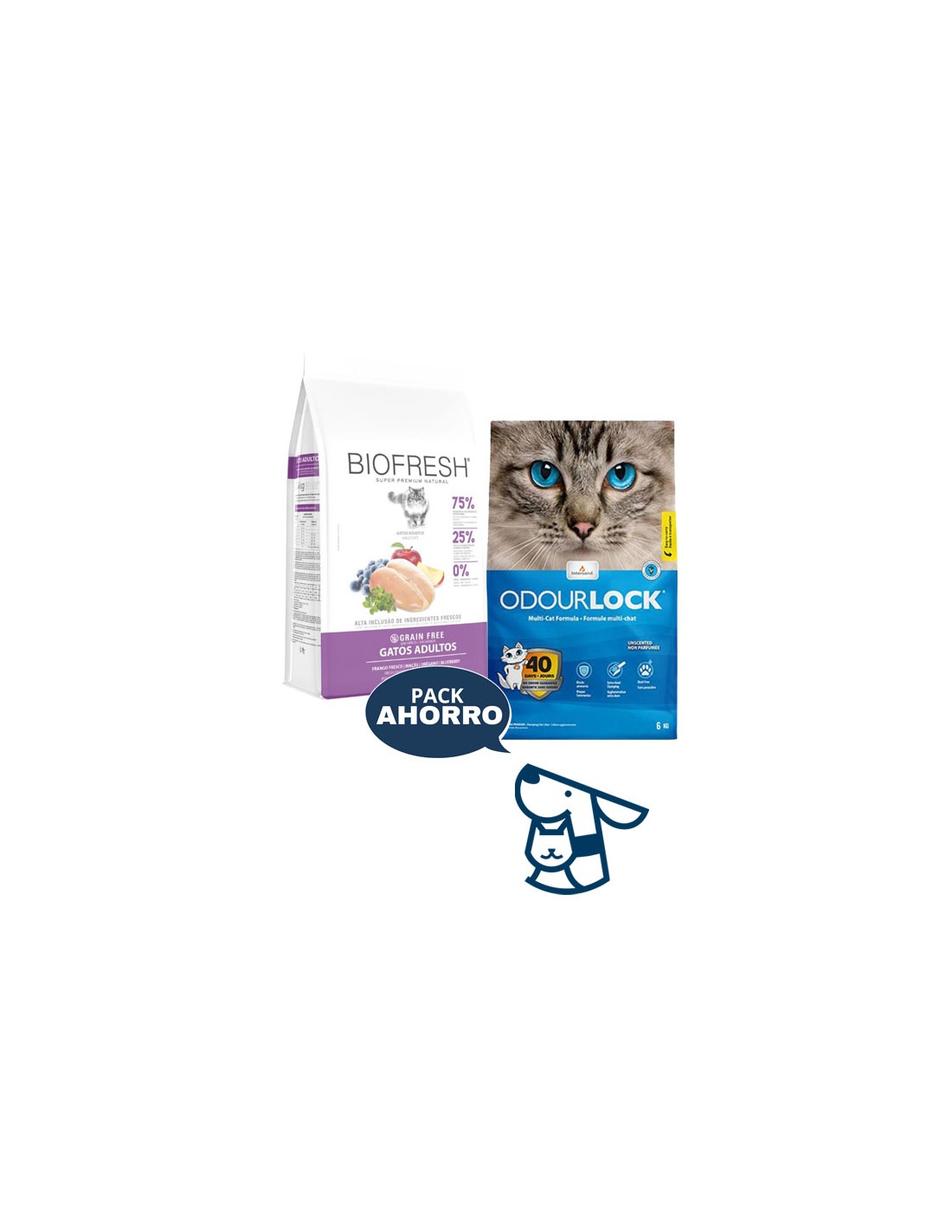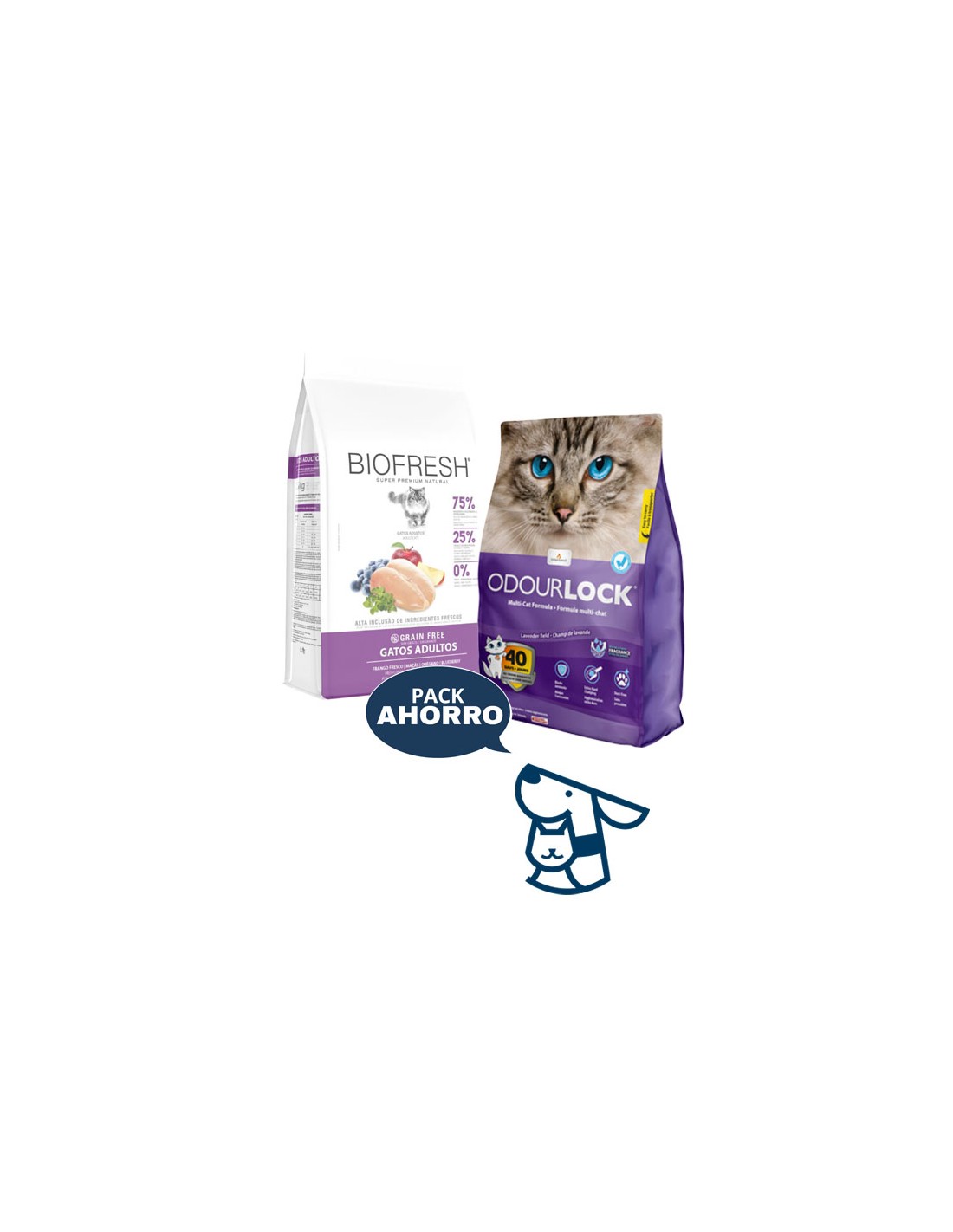 Combo Alimento Biofresh Gato Adulto sabor pollo 1.5kg + 6kg Arena Aglomerante Odourlock, aroma lavanda o sin aroma