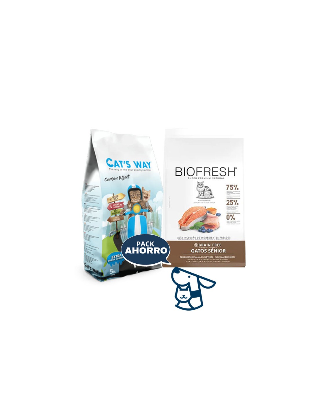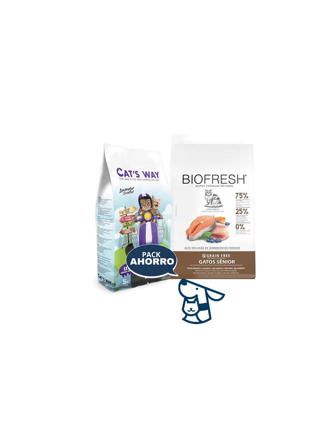 Combo Alimento BIOFRESH Gato Senior 1.5kg + 4.25 kg (5lts) arena aglomerante CATSWAY , aroma lavanda o sin aroma efecto carbón