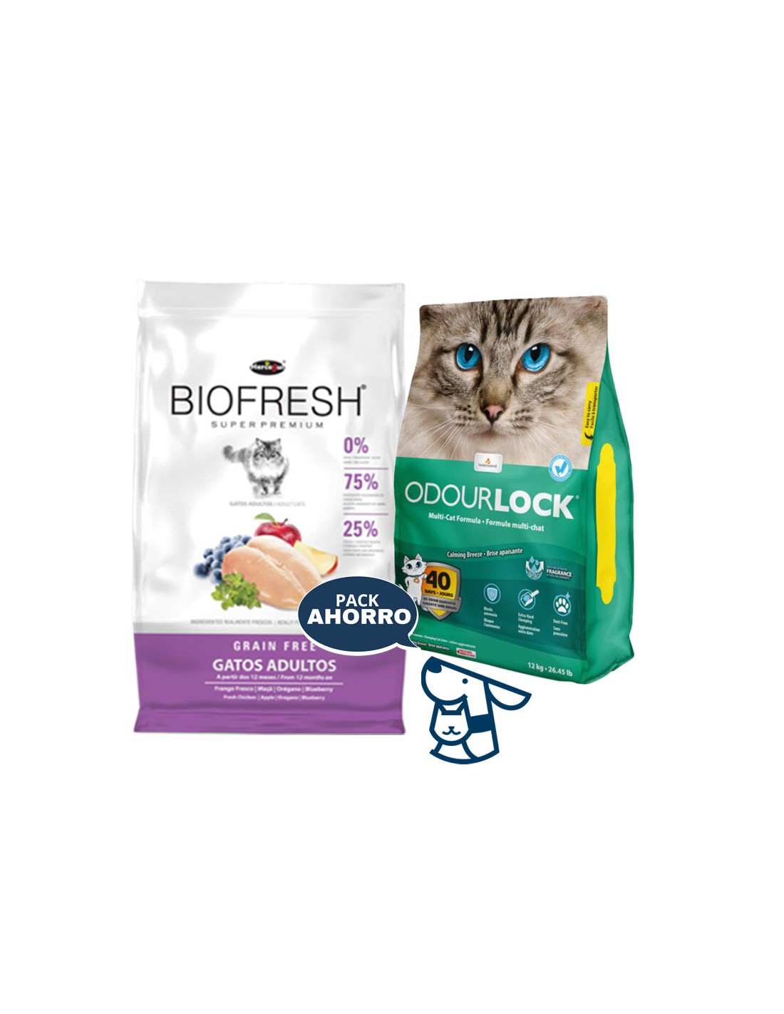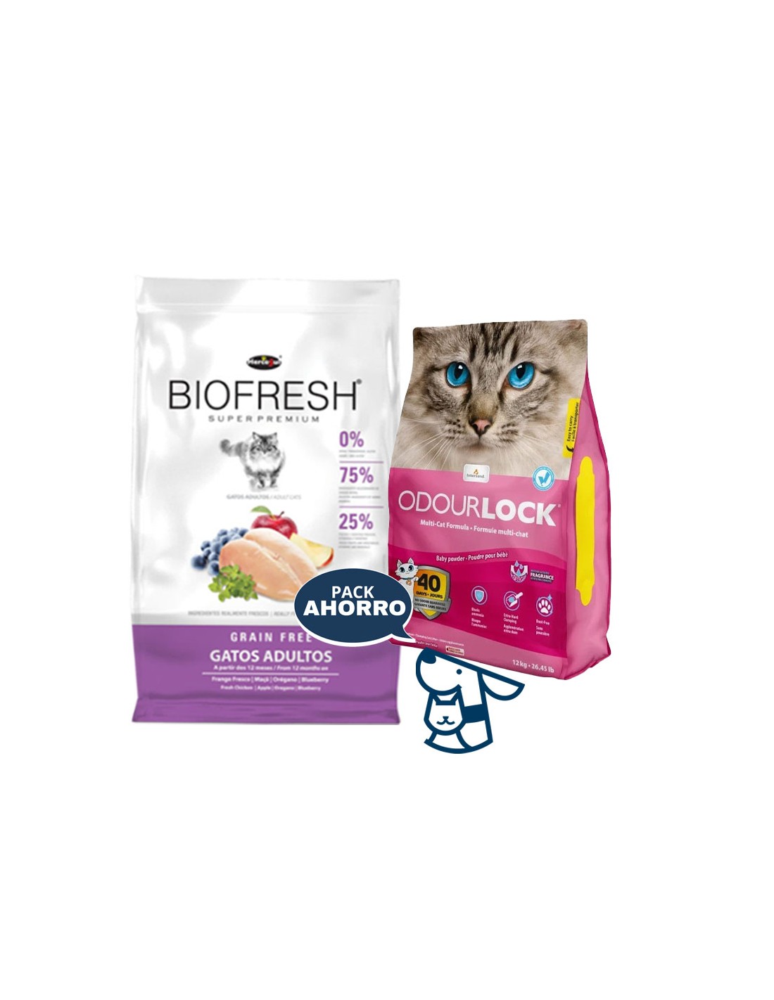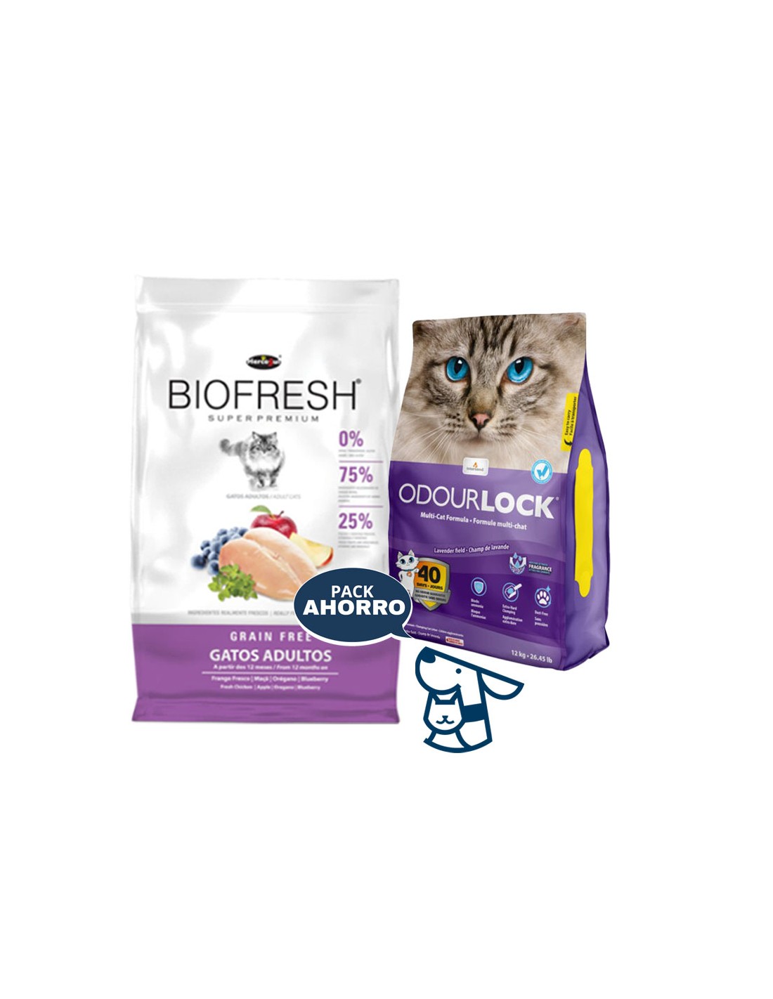 Combo Alimento Biofresh Adulto sabor pollo 7.5kg + 12kg Arena Aglomerante ODOURLOCK aroma Lavanda, Brisa Calma, Talco BB o sin aroma