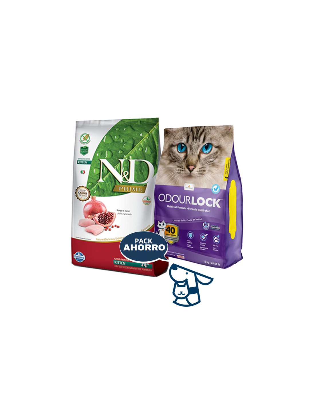 COMBO ALIMENTO NYD PRIME PARA GATITO CACHORRO KITTEN 7.5KG + 12KG ARENA AGLOMERANTE ODOURLOCK AROMA LAVANDA, BRISA CALMA, TALCO BB O SIN AROMA