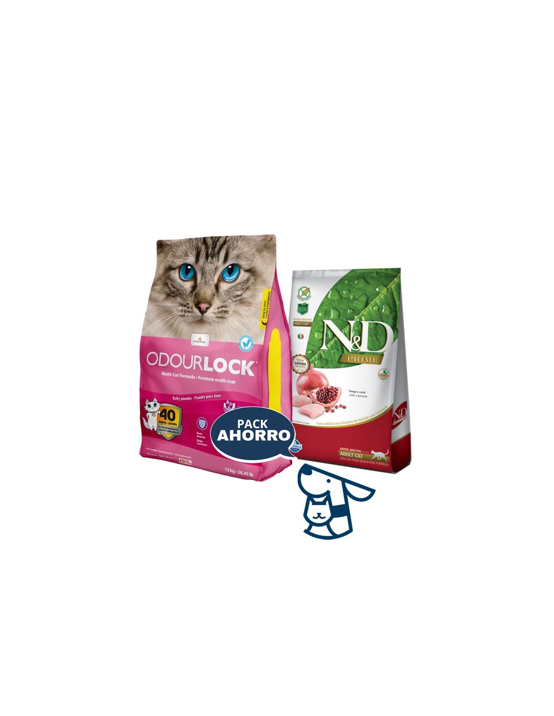 Combo ALIMENTO NYD PRIME PARA GATO ADULTO 1.5KG + 12KG ARENA AGLOMERANTE ODOURLOCK AROMA LAVANDA, BRISA CALMA, TALCO BB O SIN AROMA