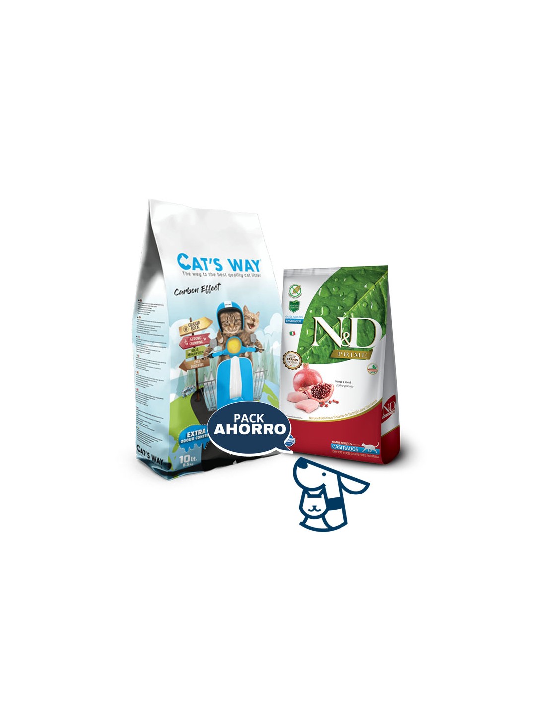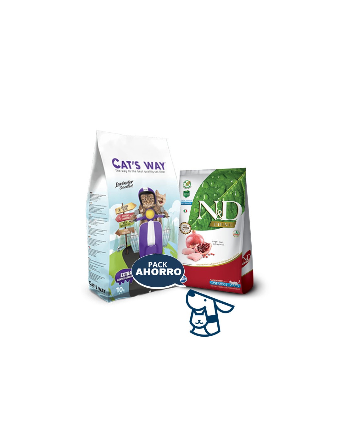 Combo ALIMENTO NYD PRIME GATO CASTRADO 1.5KG + 8.5KG (10LTS) ARENA AGLOMERANTE CATSWAY, AROMA LAVANDA, TALCOBB Y SIN AROMA EFECTO CARBON