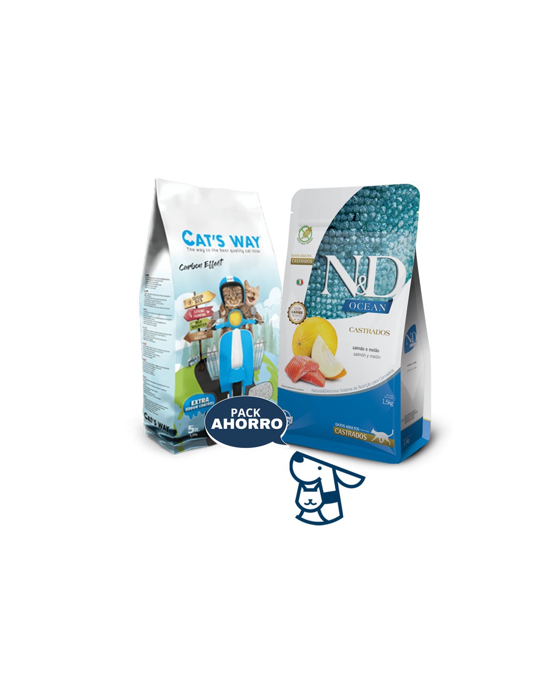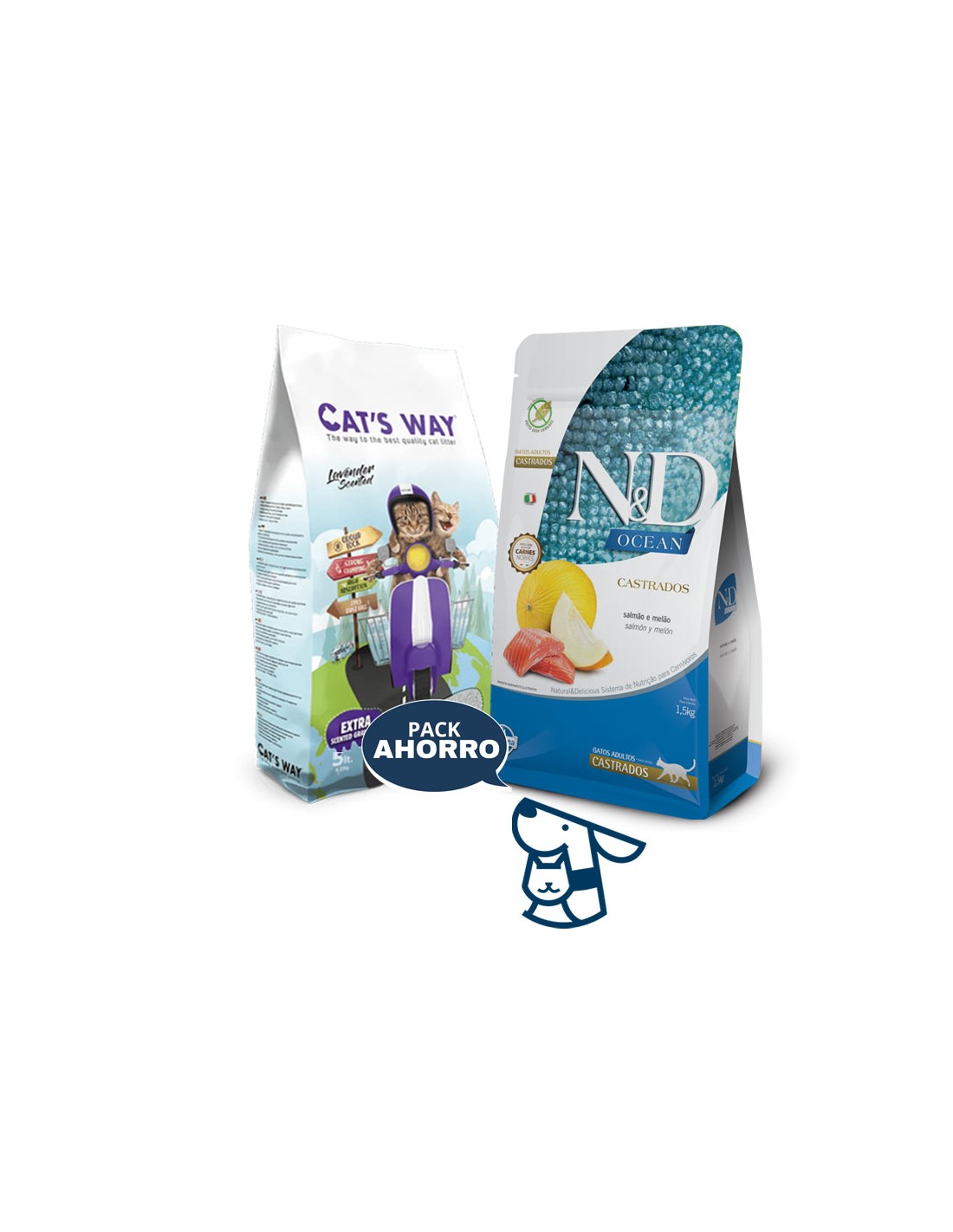 Combo ALIMENTO NYD OCEAN PARA GATO CASTRADO 1.5KG + 4.25KG (5LTS) ARENA AGLOMERANTE CATSWAY. AROMA LAVNADA O SINA ROMA EFECTO CARBON