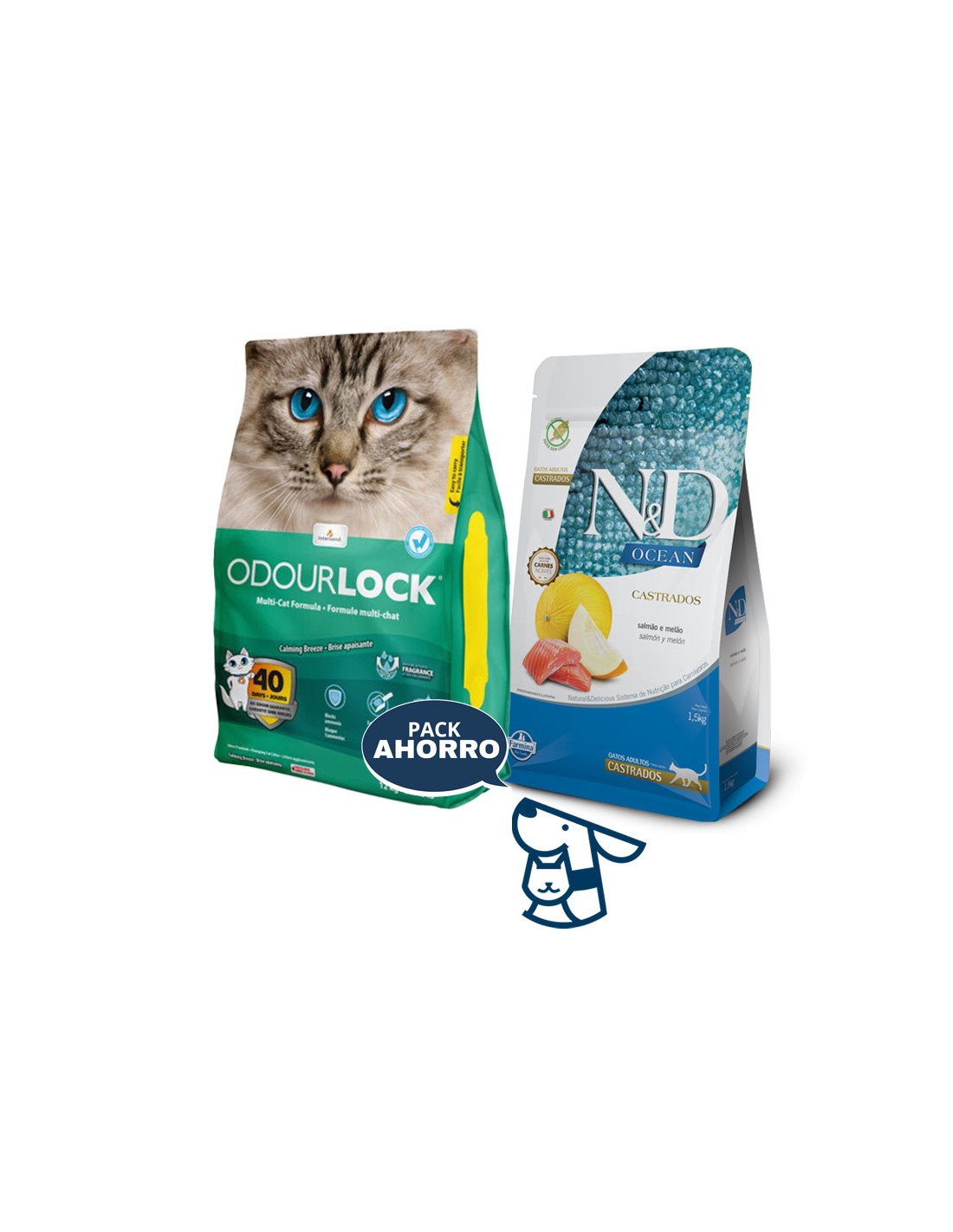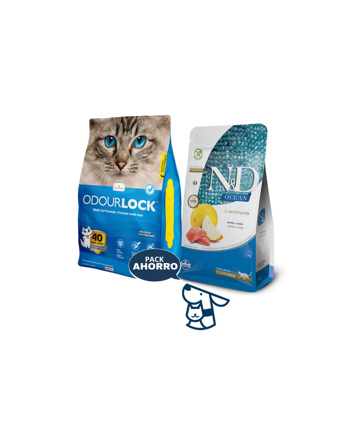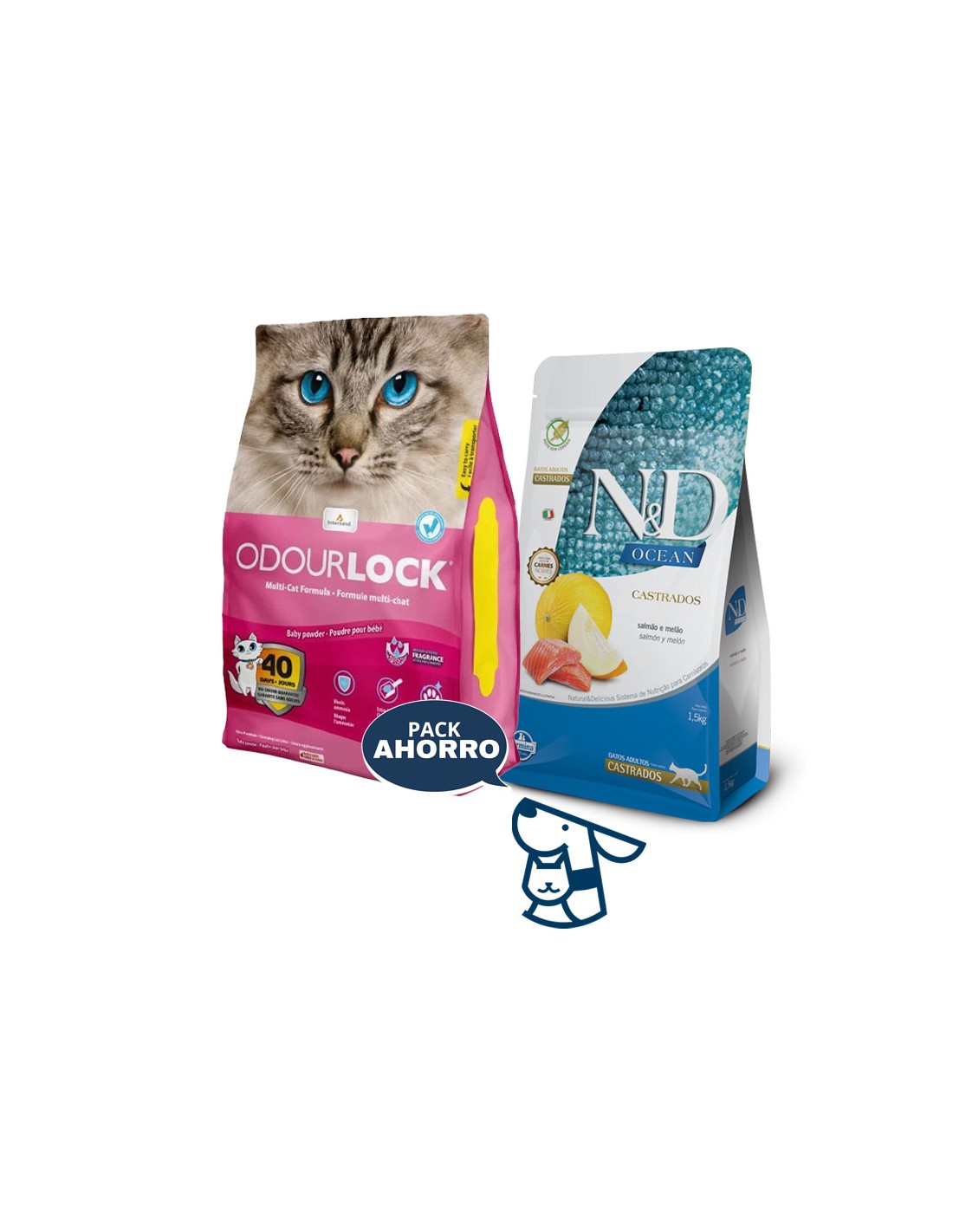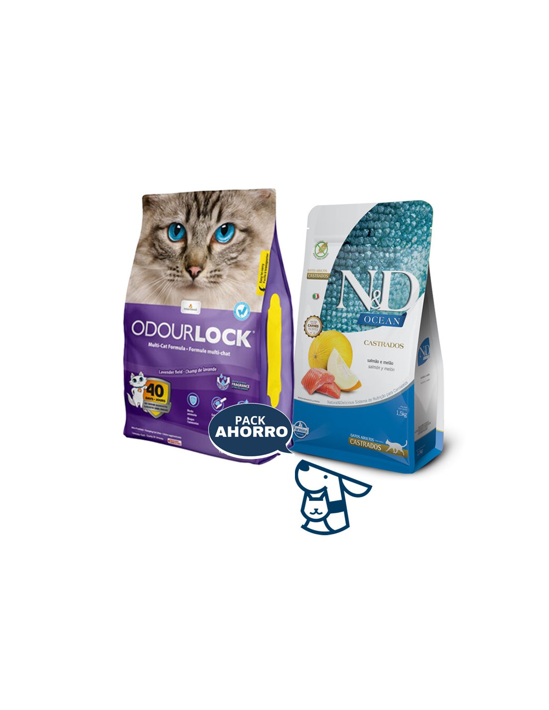 Combo ALIMENTO NYD OCEAN GATO CASTRADO 1.5KG + 12KG ARENA AGLOMERANTE ODOURLOCK, AROMAS LAVANDA, BRISA CALMA, TALCOBB O SIN AROMA