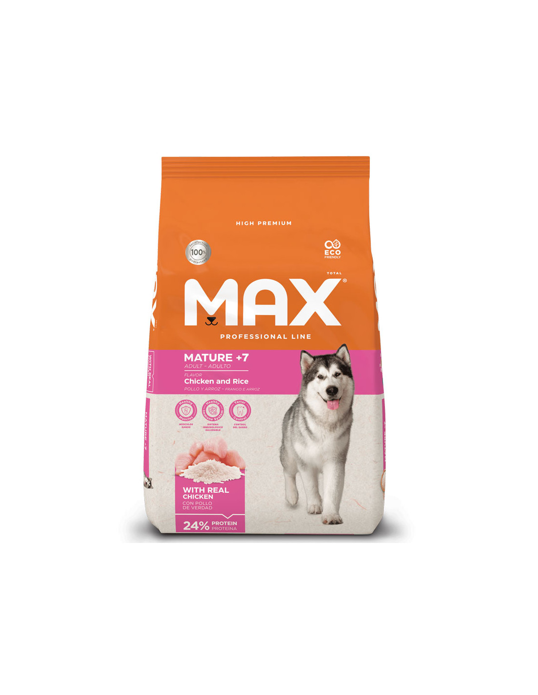 Max Mature +7 Pollo & Arroz, es un alimento Premium Especial nutricionalmente balanceado, desarrollado para perros mayores con más de 7 años de edad. Con mayor aporte de proteínas y equilibrio de las fibras, el producto lleva, además, en su composición, prebióticos, para heces más firmes. Otro diferencial importante para el bienestar de los perros en esta fase de vida es la presencia de condroitina y glucosamina, que contribuyen a las articulaciones más saludables.